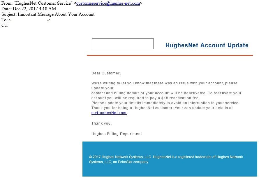 The holidays can be hectic, and it's easy to miss details when you're distracted. Don't let distraction let you compromise your computer and network. There is a new phishing e-mail going around that says it's from HughesNet; it's not. Pay attention to the email address, that Hughes-Net domain is not from us, and we would not threaten to deactivate your account like this: