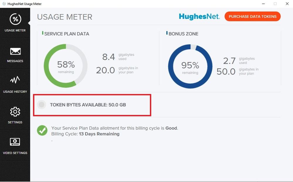 With that said, in case you aren't aware, though there is no pie graph for data tokens, there is a spot on the Usage Meter and the various other places that your remaining data is shown. It's shown as Token Bytes Available. On the Usage tab of the MyAccount site it shows as Data Tokens Available. On the System Control Center, just Token Bytes. And, when you have tokens available like this, the usage of the token data will automatically kick in when you exhaust the data in one, or both, of the other two data banks, depending on the data time period your presently in while online. IOW, from 8AM to 2AM, it's Service Plan Data, then Token Data. From 2AM to 8AM, it's Bonus Zone data, then Service Plan Data, then Token Data. During each of the two time periods, the successive data bank kicks in automatically when the preceding one is exhausted. This is just for info in case you aren't aware of how the data is used and how the successive data bank kicks in automatically.