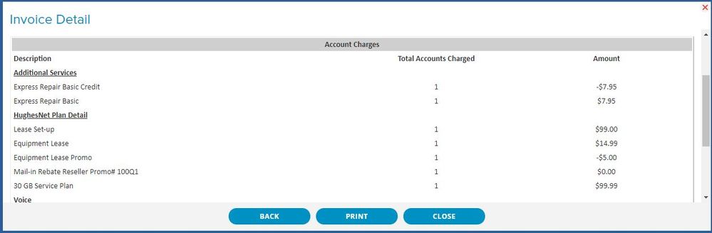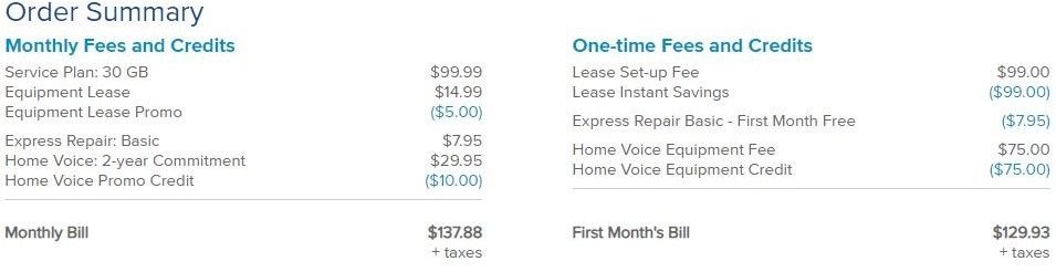 When I signed up for HughesNet, I received an order summary showing my Monthly Fees and Credits and the One-time Fees and Credits.