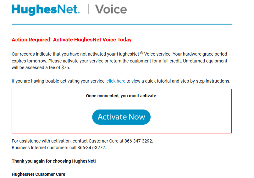Are the notices coming to your email? Does it show on the HughesNet MyAccount site (the Voice section) that it still needs to be activated?