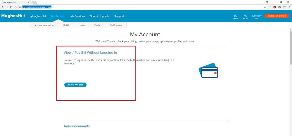 I had a similar issue for months when making my payment and used to have to use the old site. With you being on SSDI, you probably have the DirectExpress card, like I do. It used to not work on the present site, but I found that I am now able to make a payment using the View / Pay Bill Without Logging In part on the Hughesnet myAccount site. http://my.hughesnet.com/myaccount Under that View / Pay My Bill Without Logging In, I click on the View/Pay Bill button, then enter the info it asks for. I use my DirectExpress card as a Credit Card, not a debit card, when making payment. I've never tried using it as a debit card. If it's not working for you using it as a debit card try it as a credit card.