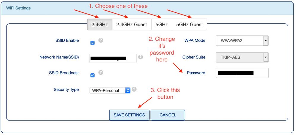 Go to this modem page and use admin as the password. On that page you can change the password for the 2.4GHz band. Make sure to click Save Settings after changing it. If you need to change the 5GHz password, click on the 5GHz header and change the password for that, then click Save Settings. And, of course, make sure to write down your new password(s).