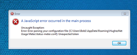 I tried you suggestion. I cannot find the "status-meter.conf" file when I go to the folder that is labelled "HughesNet Usage Meter" on the "C" drive in Program Files. I tried the enable show hidden files/folders to find it, however, it did not reveal the "status-meter.conf" file. I am still getting the same JavaScript error message that kitnbob posted. Any suggestions would be appreicated.