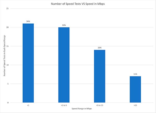 - 88 % of all speed tests are less than 15 Mbps and 67% are LESS THAN 5 Mbps